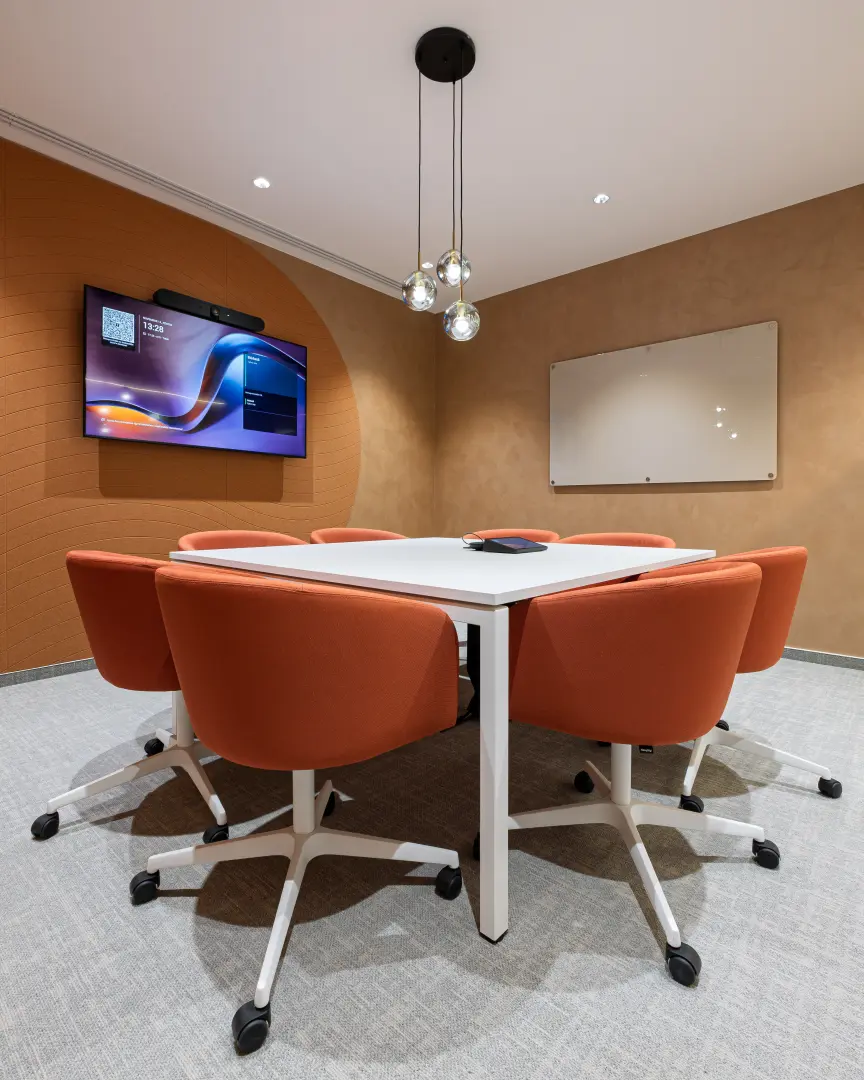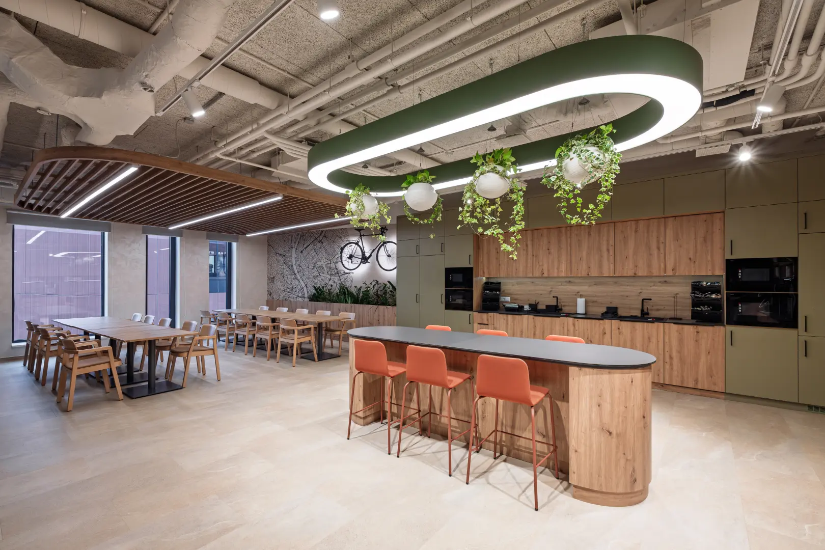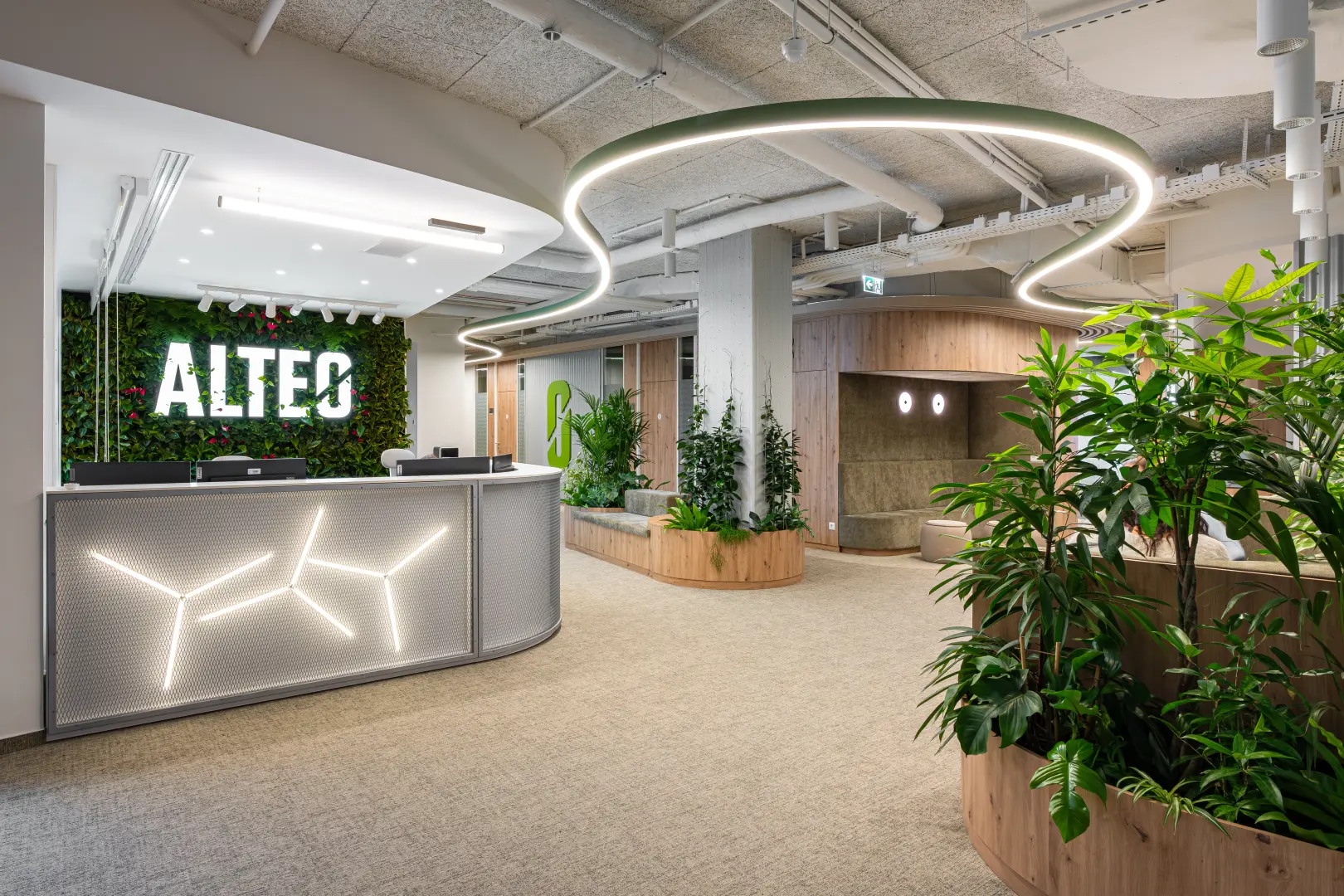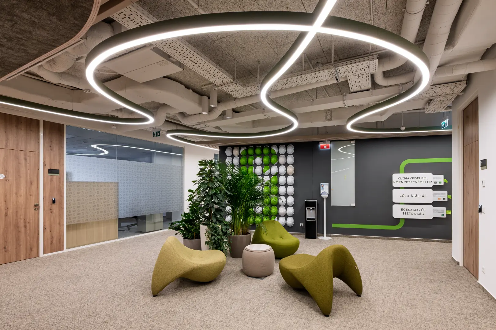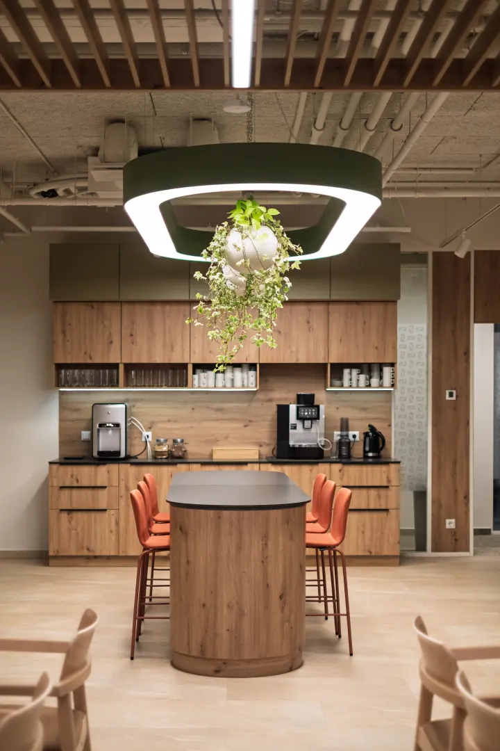 A fa, a zöld felületek, az íves formák és az ezzel harmonizáló kiegészítők együtt egy olyan környezetet hoznak létre, ahol a tér élhető, a működés pedig átgondolt; egyszerre támogatja a közösségi jelenlétet és a koncentrált munkát.