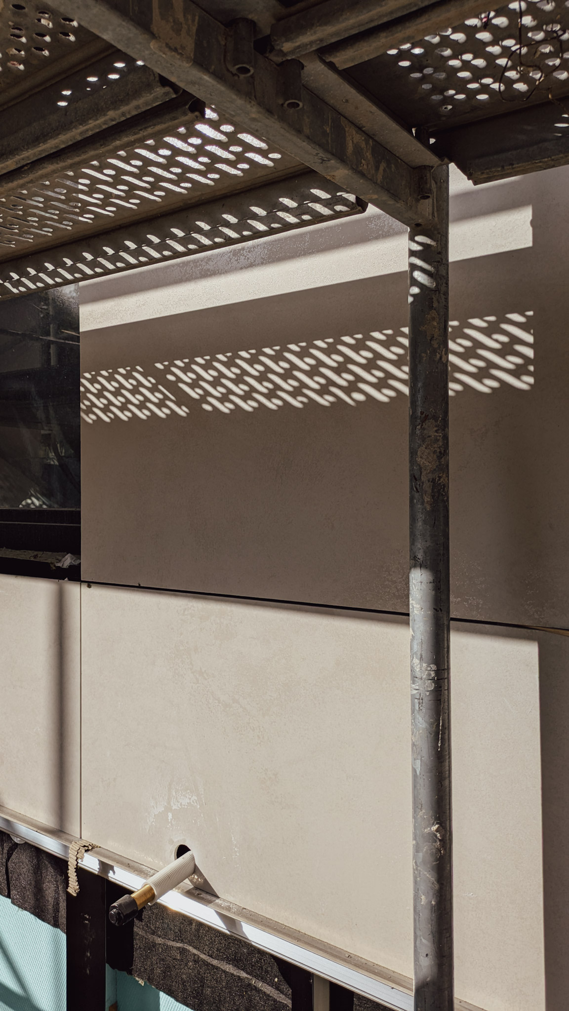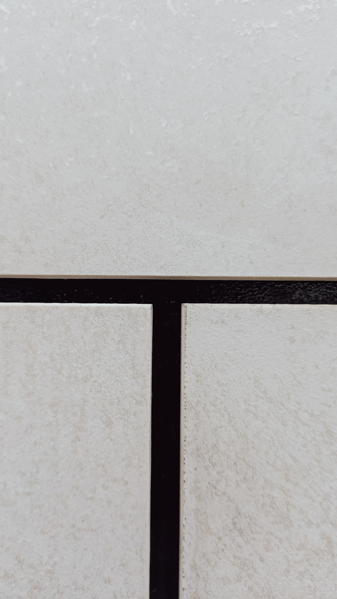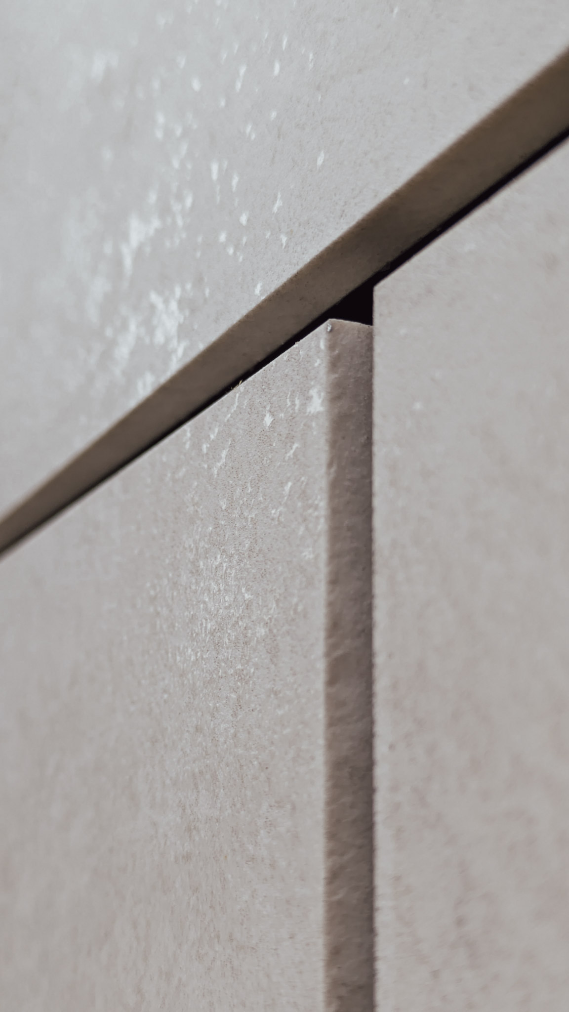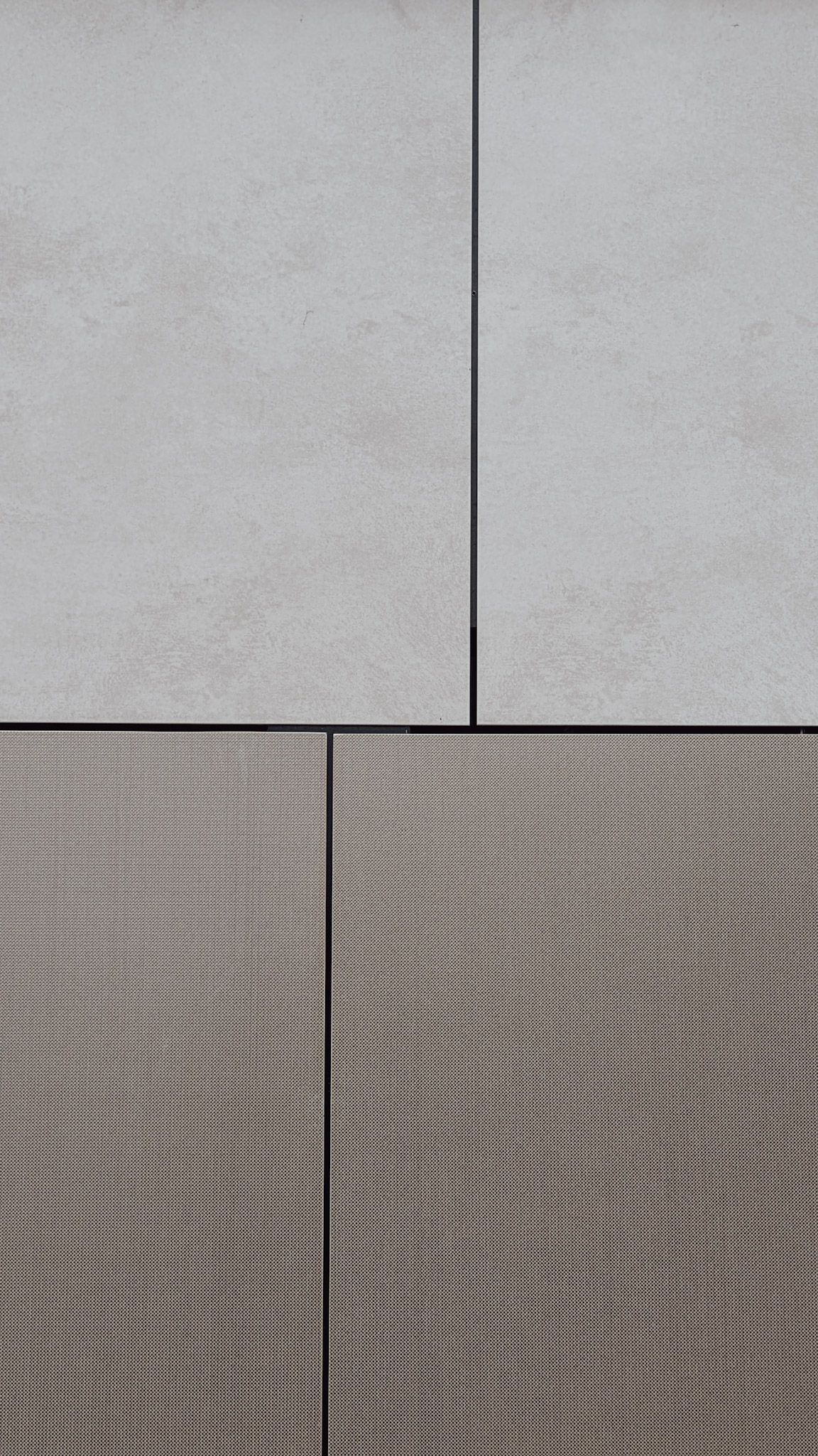 A burkolat Laminam Oxide Avorio és Laminam Filo Oro lapokból épül fel. Az Oxide Avorio világos, enyhén foltos felülete egy nyugodt hátteret ad, erre ül rá a Filo Oro finom, sűrűbb mintázata, ami közelebb lépve válik igazán láthatóvá. A két anyag váltása nem hangsúlyos, inkább egy rétegzett, visszafogott játék a felületen.