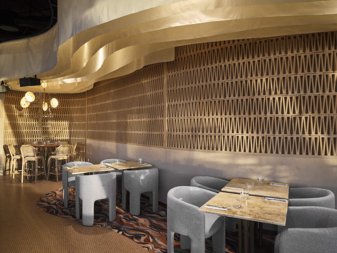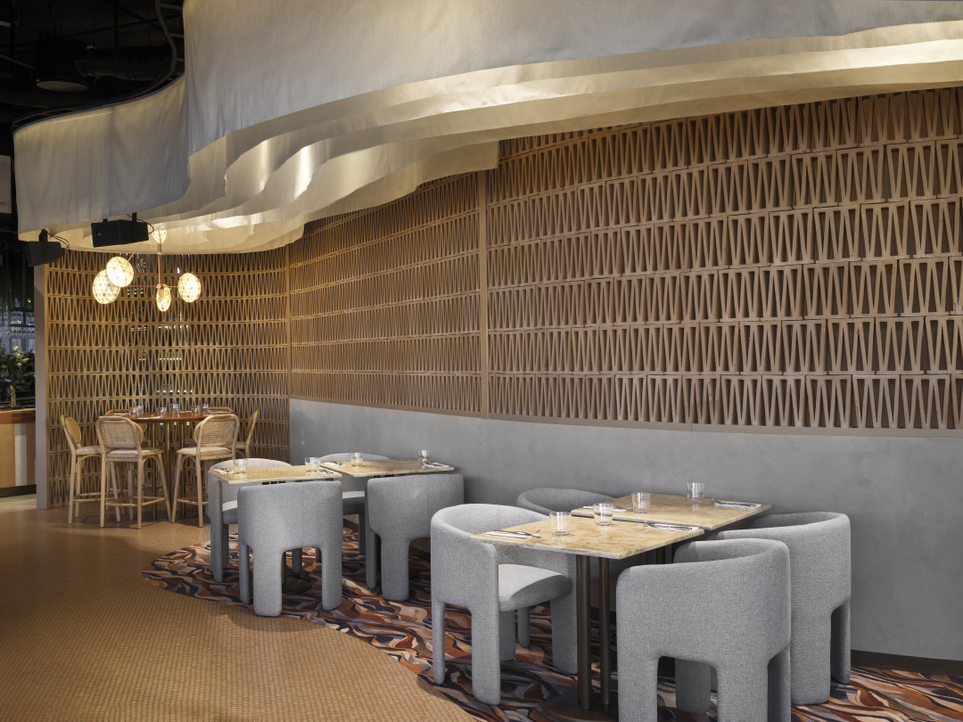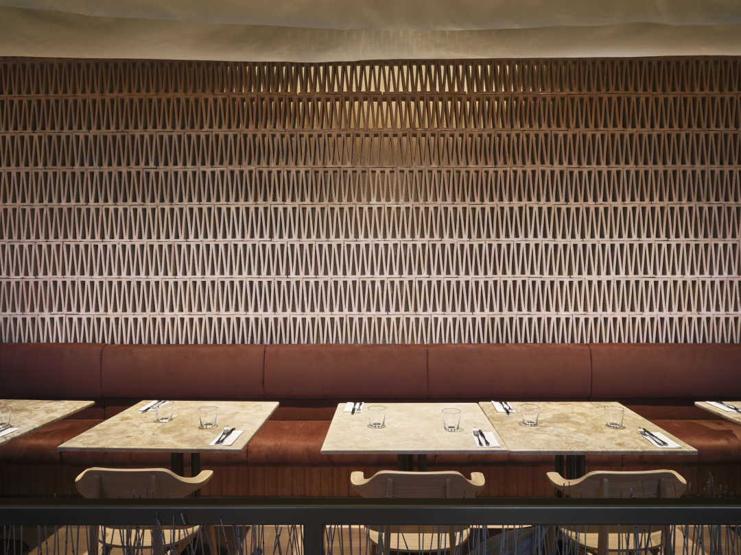 A MOL Campus földszintjén található Zazie bistro&bar projekt egyik legfontosabb vizuális elemévé a Mutina áttört agyagburkolata vált.